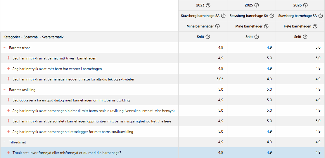 23.02.2026 08.25Stavsberg barnehage SA leverer igjen svært sterke resultater i Utdanningsdirektoratets foreldreundersøkelse. Med en skala fra 1,0 til 5,0 – der 5,0 er høyeste mulige score – ligger vi helt i toppsjiktet på sentrale områder som trivsel, utvikling og samarbeid med hjemmet.