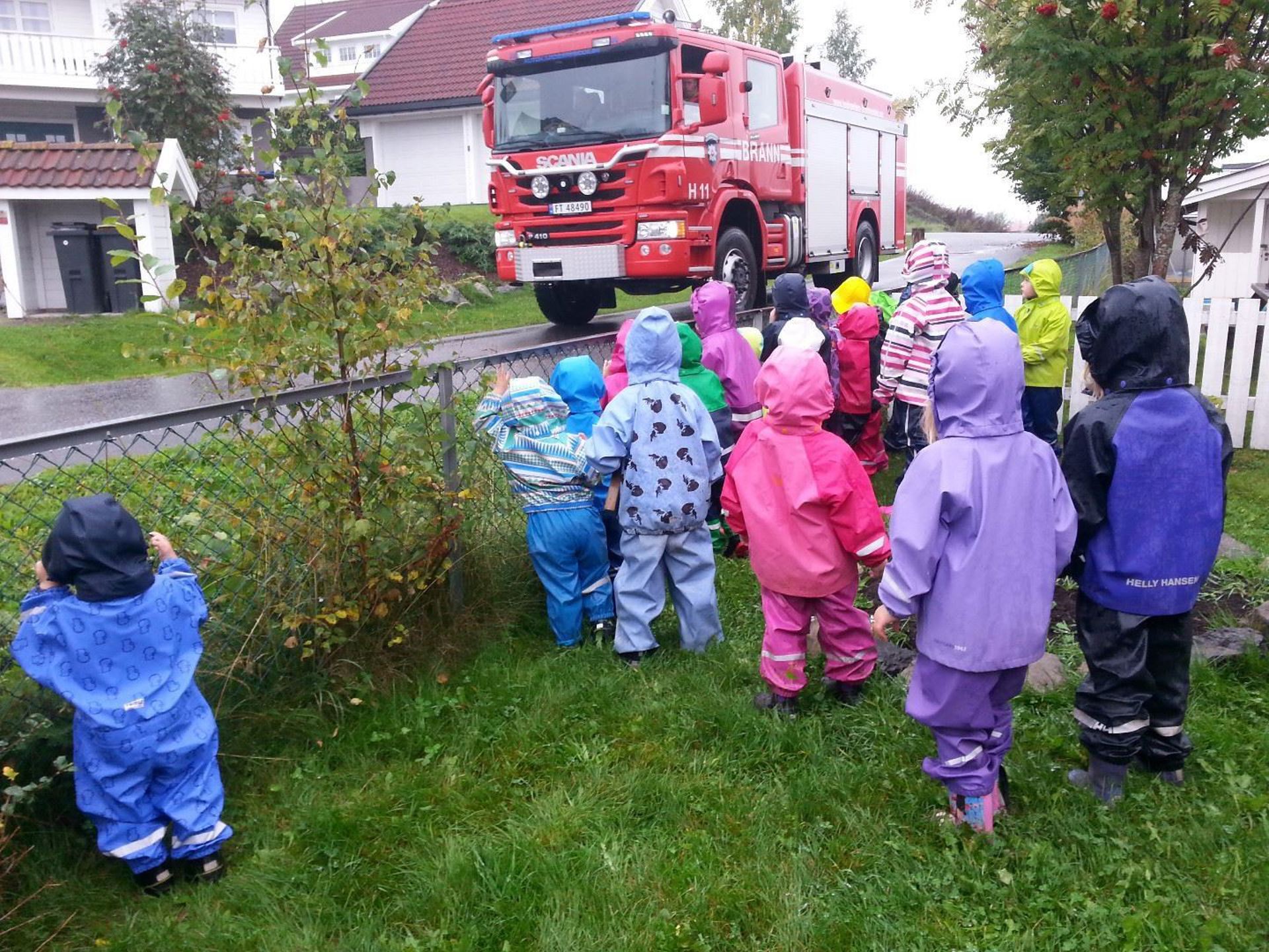 Stor begeistring da vi fikk besøk av brannbilen i dag. Her fikk barna prøvd brannslangen, hjelmer og utforsket hvordan brannbilen er innvendig. Hele uken er viet brannvern.